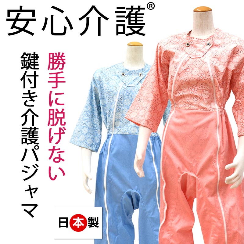送料無料 介護 パジャマ 国産 日本製 全開ファスナー 鍵付き 介護用パジャマ 介護パジャマ つなぎ メンズ レディース 紳士 婦人 サイズ s m l ピンク ブルー イエロー Aq K こだわり安眠館